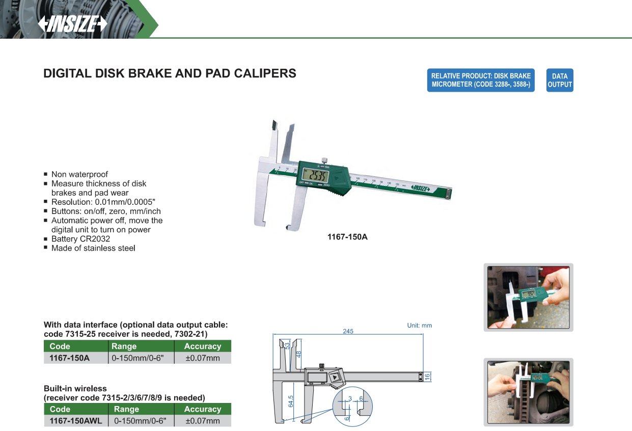 The INSIZE 1167-150A Electronic Disk Brake and Pad Caliper has the following specifications: