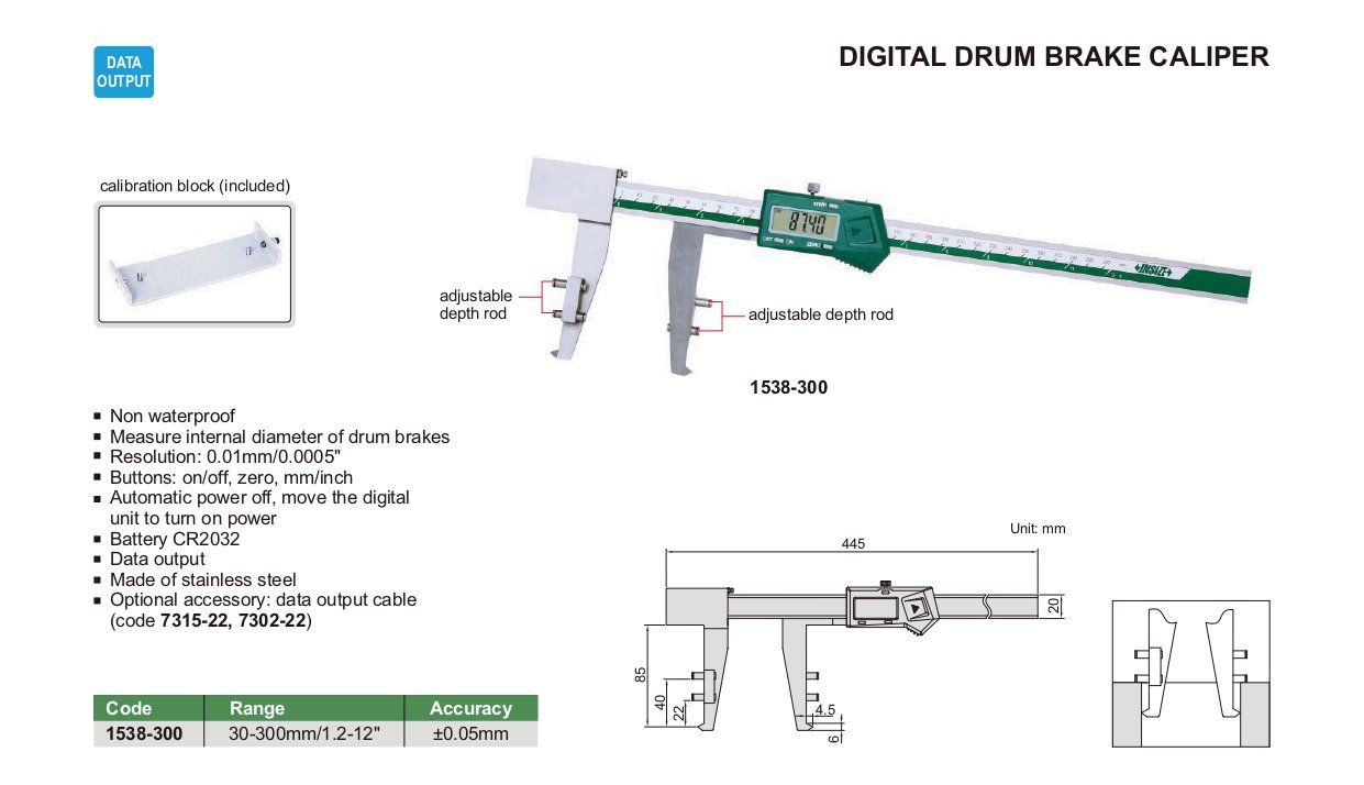 The INSIZE 1538-300 Electronic Drum Brake Caliper has the following specifications: