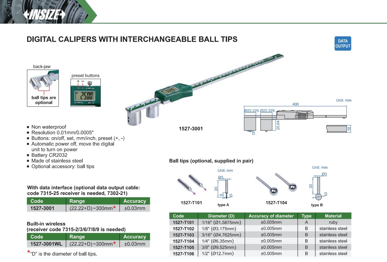 The INSIZE 1527-3001 Digital Caliper with Interchangeable Ball Tips has the following specifications: